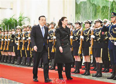 4月1日,国务院总理李克强在北京人民大会堂同新西兰总理阿德恩举行会谈。这是会谈前,李克强在人民大会堂北大厅为阿德恩举行欢迎仪式。