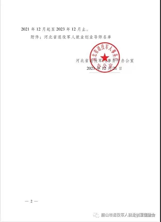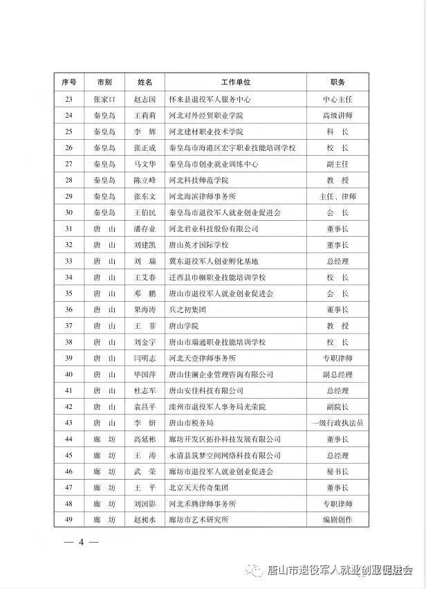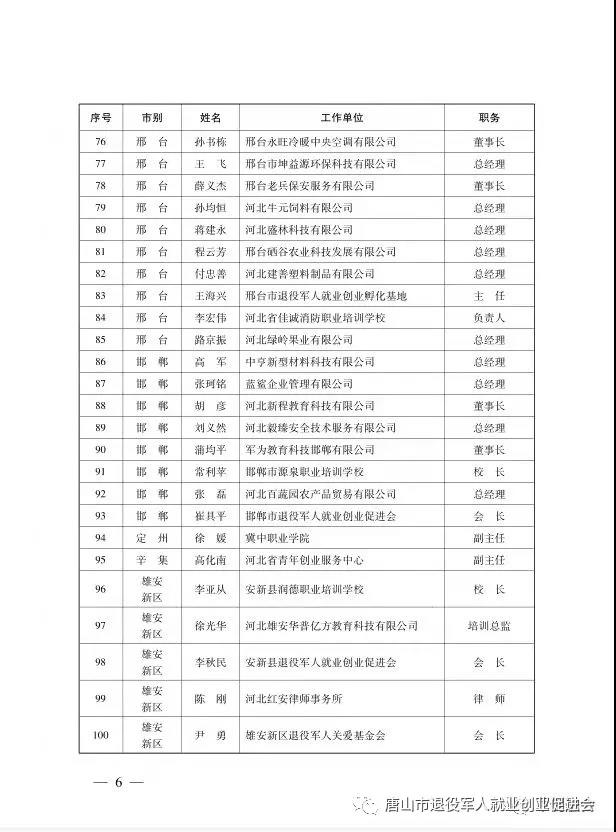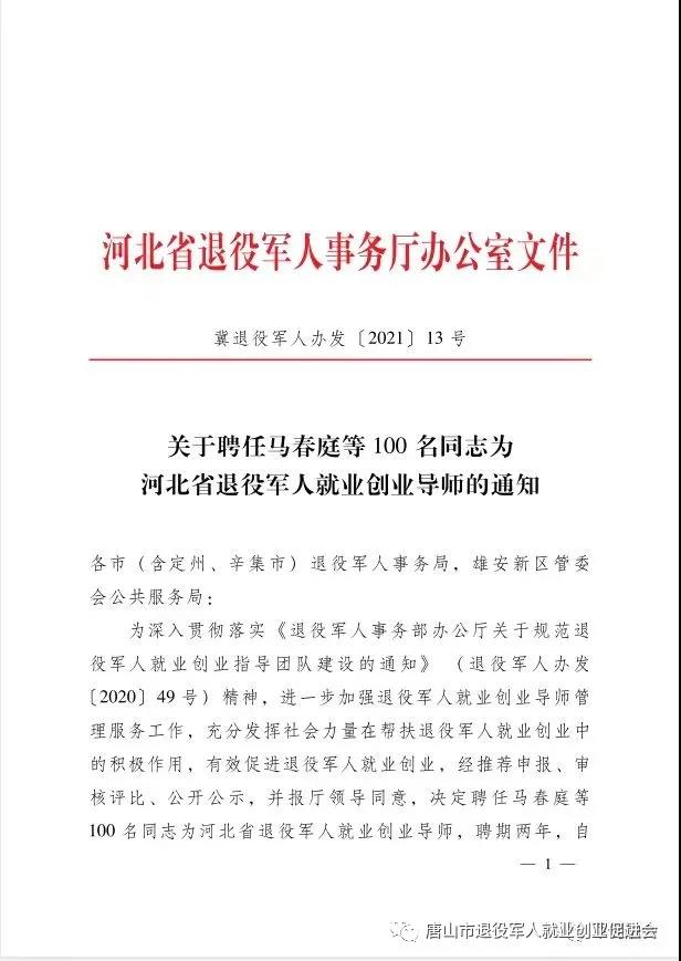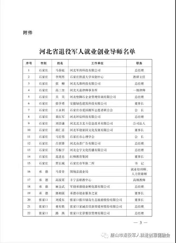 近日从河北省退役军人事务厅获悉:河北省100名退役军人创业导师名单确定。来自于唐山市的邓鹏、王永玲、杜志军、果海涛、刘瑞等榜上有名。