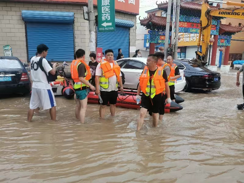蠡县退役军人志愿者积极参加巡堤查险,对潴龙河堤坝和低洼地带进行风险隐患排查,并向前来观水的人民群众宣传防溺水安全知识。 以退役军人为主的高阳县爱国者救援队15名队员携带三艘皮划艇到涿州市潘各庄镇周边村庄开展救援工作。