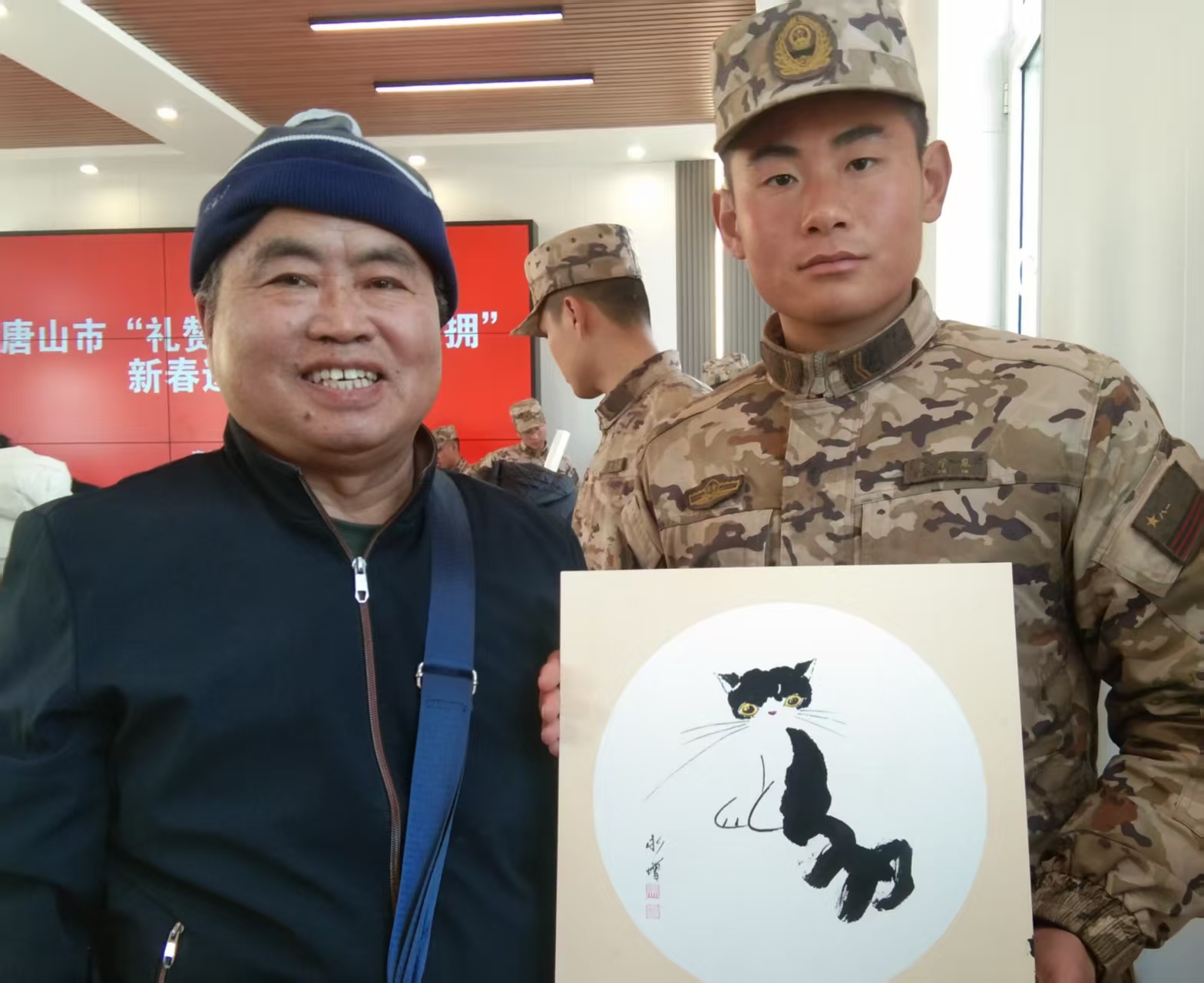 唐山市退役军人事务局局长王合成,唐山市退役军人事务局副局长、唐山军分区政治工作处任韩金国,唐山市退役军人事务局副局长刘连军,武警唐山支队某部领导及原唐山市书法家协会、美术家协会会长韩瑛、周祖光,原唐山市退役军人就业人创业促进会会长邓鹏等参加了本次活动。张世泽、白凤鸣、冯文升、陈沛玉等40名书画家挥毫泼墨,为武警广官兵送去了一场文化盛宴。