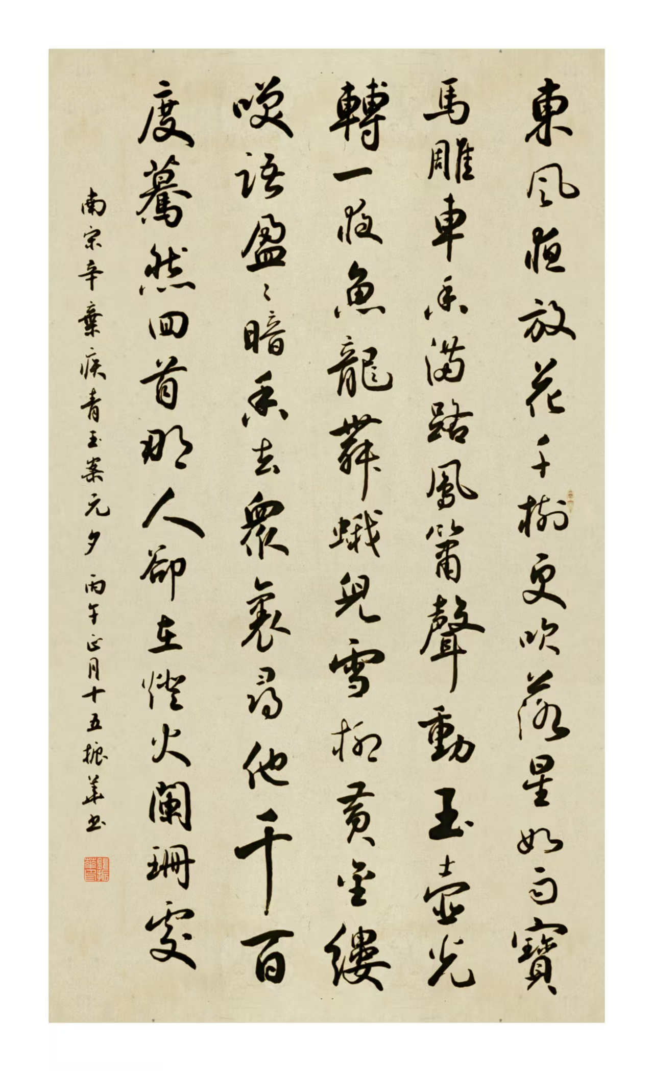 南宋 辛弃疾《青玉案·元夕》:东风夜放花千树,更吹落、星如雨。宝马雕车香满路。凤箫声动,玉壶光转,一夜鱼龙舞。 蛾儿雪柳黄金缕,笑语盈盈暗香去。众里寻他千百度,蓦然回首,那人却在灯火阑珊处。