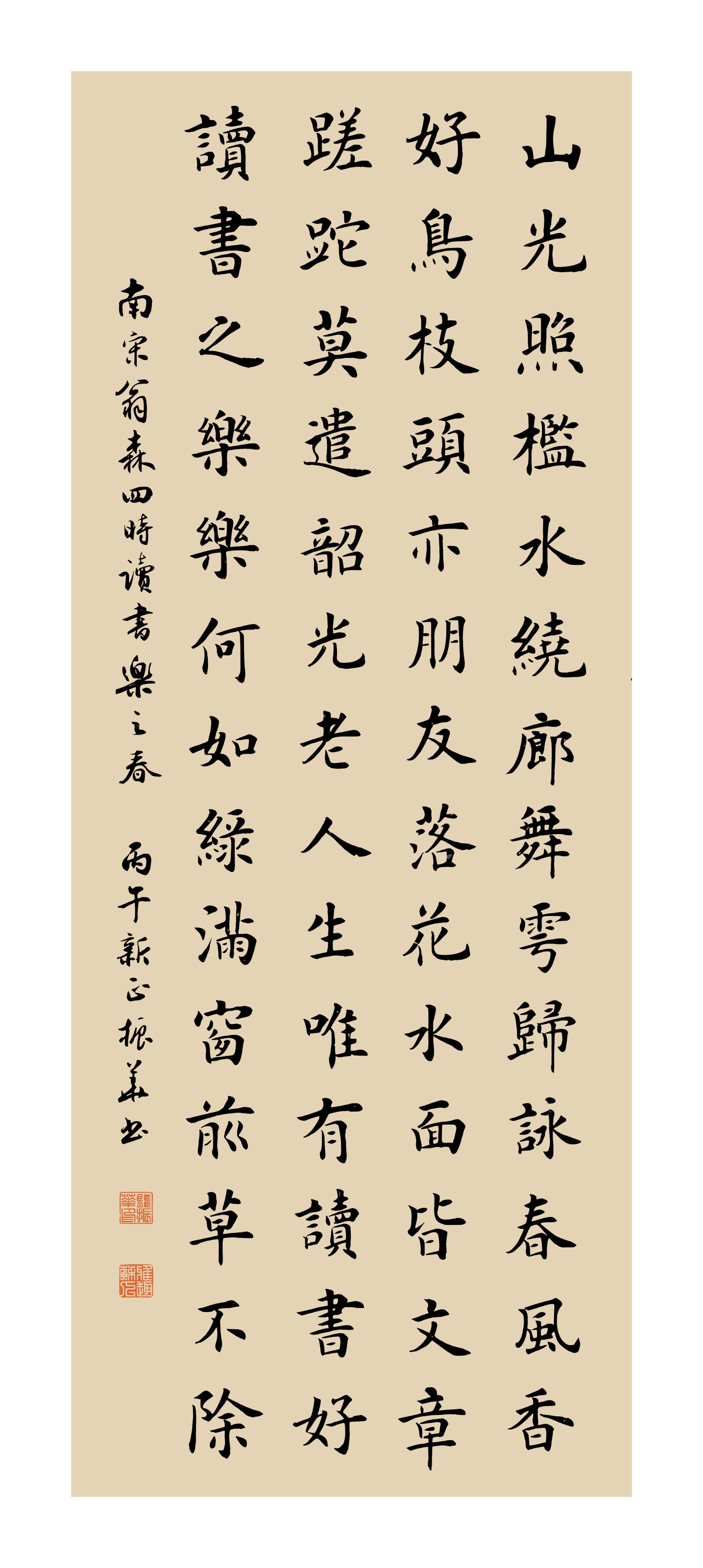 南宋 翁森《四时读书乐·春》:山光照槛水绕廊,舞雩归咏春风香。好鸟枝头亦朋友,落花水面皆文章。蹉跎莫遣韶光老,人生唯有读书好。读书之乐乐何如,绿满窗前草不除。