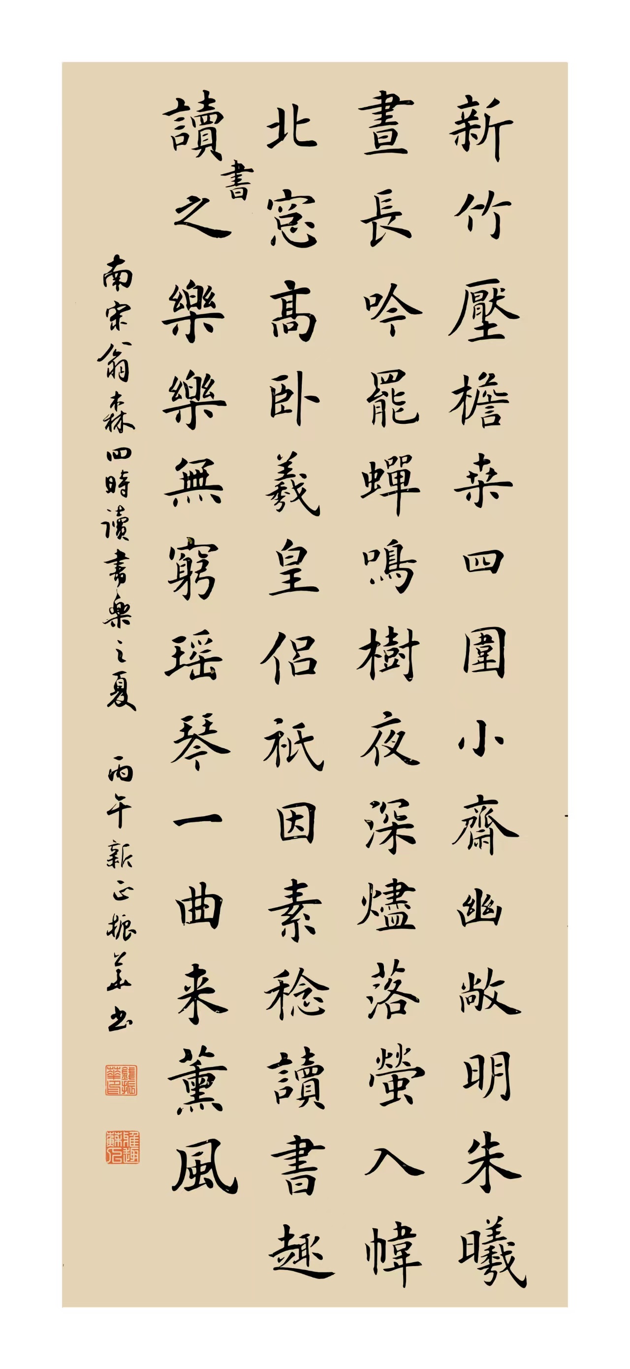 南宋 翁森《四时读书乐·夏》:新竹压檐桑四围,小斋幽敞明朱曦。昼长吟罢蝉鸣树,夜深烬落萤入帏。北窗高卧羲皇侣,只因素稔读书趣。读书之乐乐无穷,瑶琴一曲来薰风。