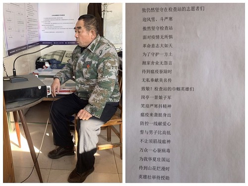“打赢疫情防控人民战争,不仅仅只是打好阻击战,还要打好心理战、舆论战、宣传战。”峪三村党支部书记刘长武,这位善做思想政治工作、军队里有名的诗人,说这番话时格外坚定。“今年春节莫乱跑,感染肺炎不得了……”这是他每天都要对着大喇叭广播的话,通俗易懂的内容,富有特色的方言,受到群众的喜爱。疫情发生后,在他的倡议下,村里的退役军人成立志愿突击队,白天还要在卡点执勤,深夜回家还要用创作抗议疫情顺口溜,成为乡间小道上“永不消逝的电波”。