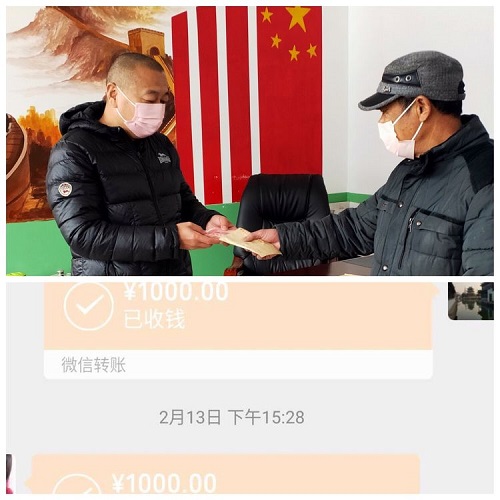 定营房村孙景春既是公司老总,也是一名退伍军人,退出现役后,凭着有一股军人的作风,待人坦诚,做事干练,更有一颗大爱的心,疫情当前,虽不能回家乡和父老乡亲一起抗击疫情,托亲戚送来一份爱心捐款5000元。同村退伍军人怀永山也微信转账1000元。
